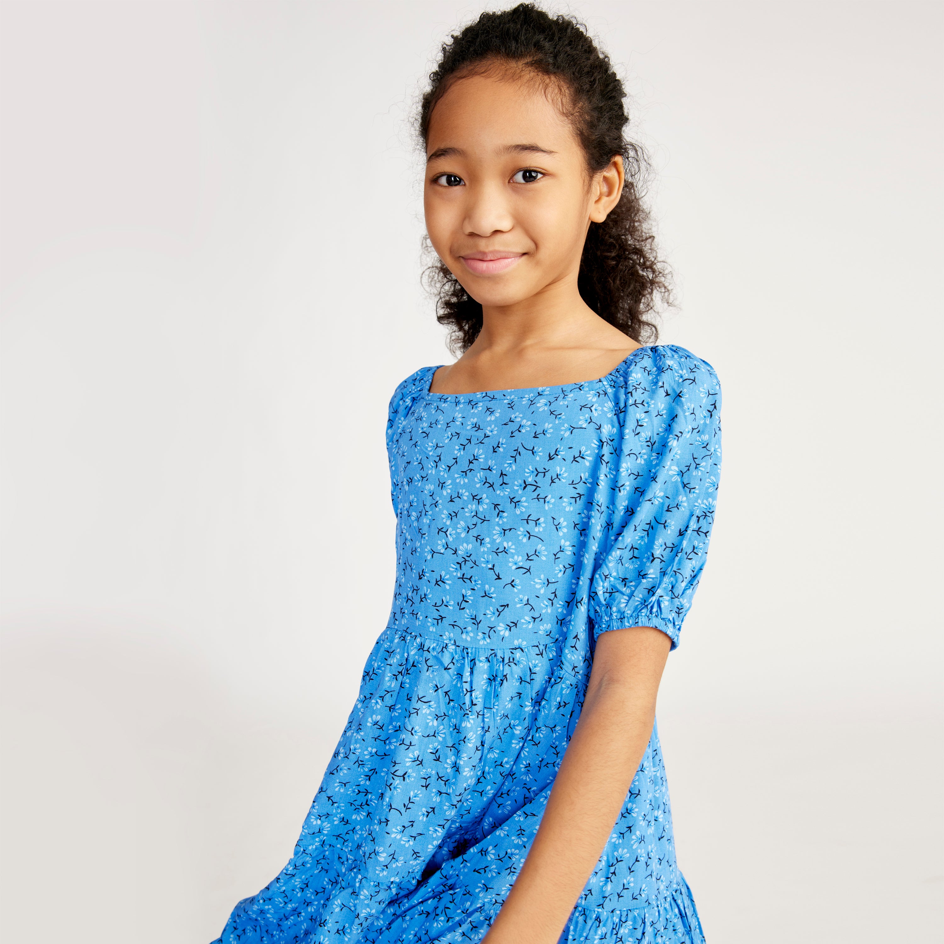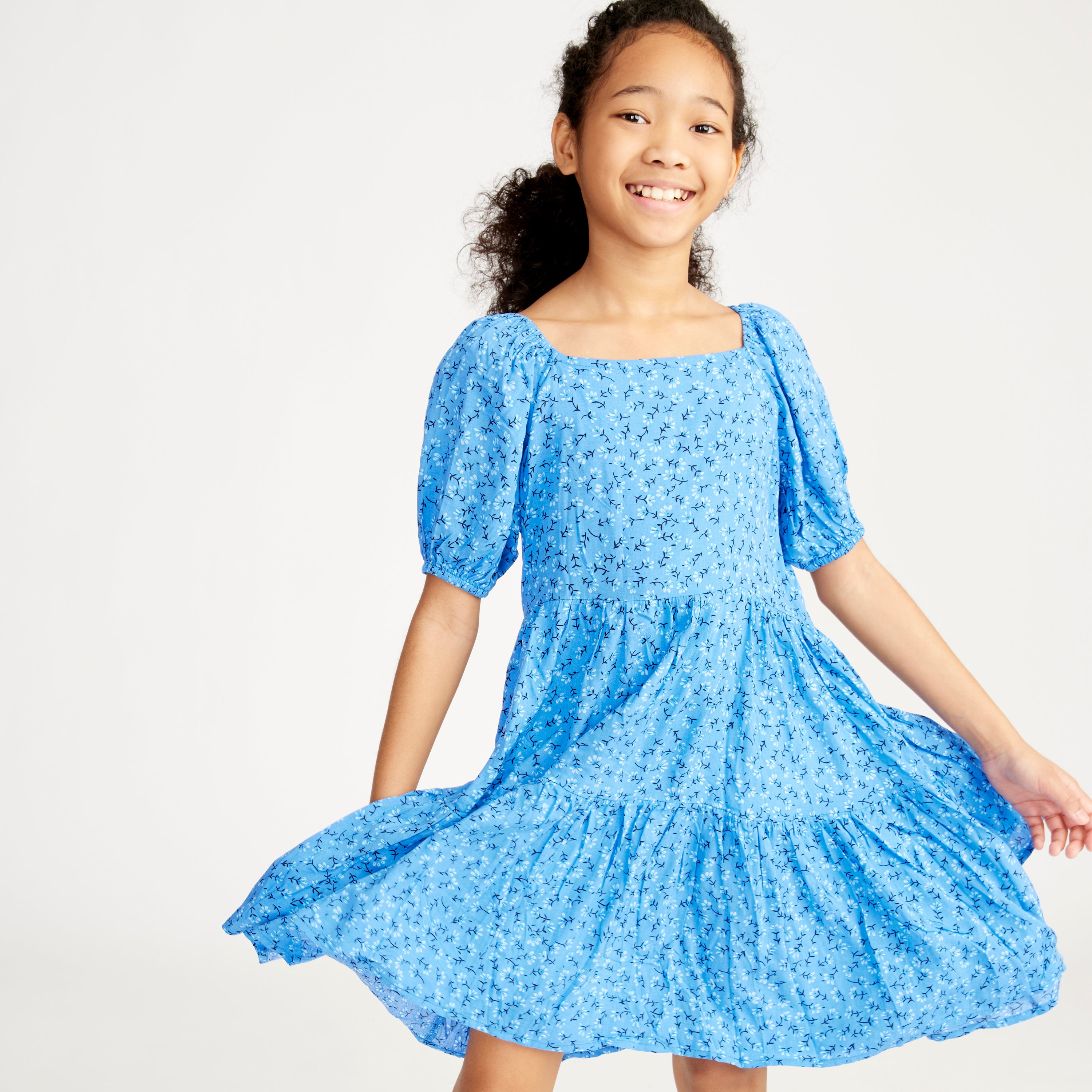 This Kidpik Girl's babydoll dress is featured in blue rayon fabric with tonal blue flowers scattered throughout. It's the perfect transition piece that will work well into the fall season. The body is easy fitting and the length is around the knee. With easy pull on styling, pair this with your favorite sneakers for a casual cool look.
