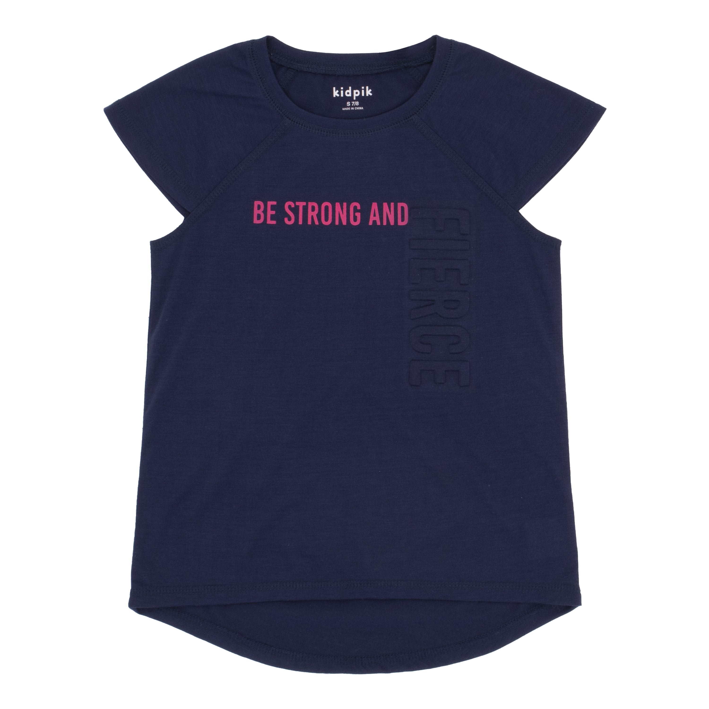 Be Strong and Fierce. This raglan tee features a mixture of embossing and printed graphic.