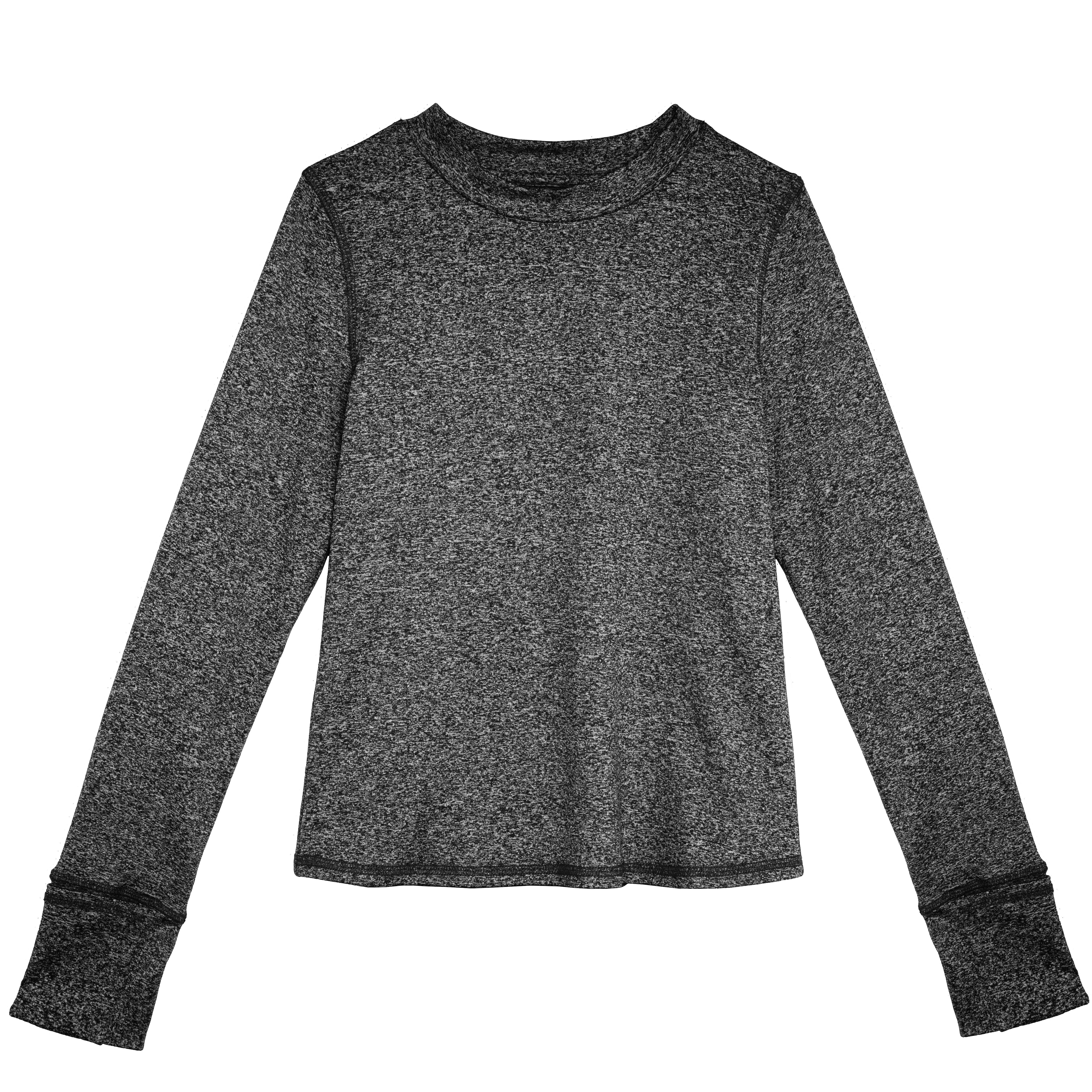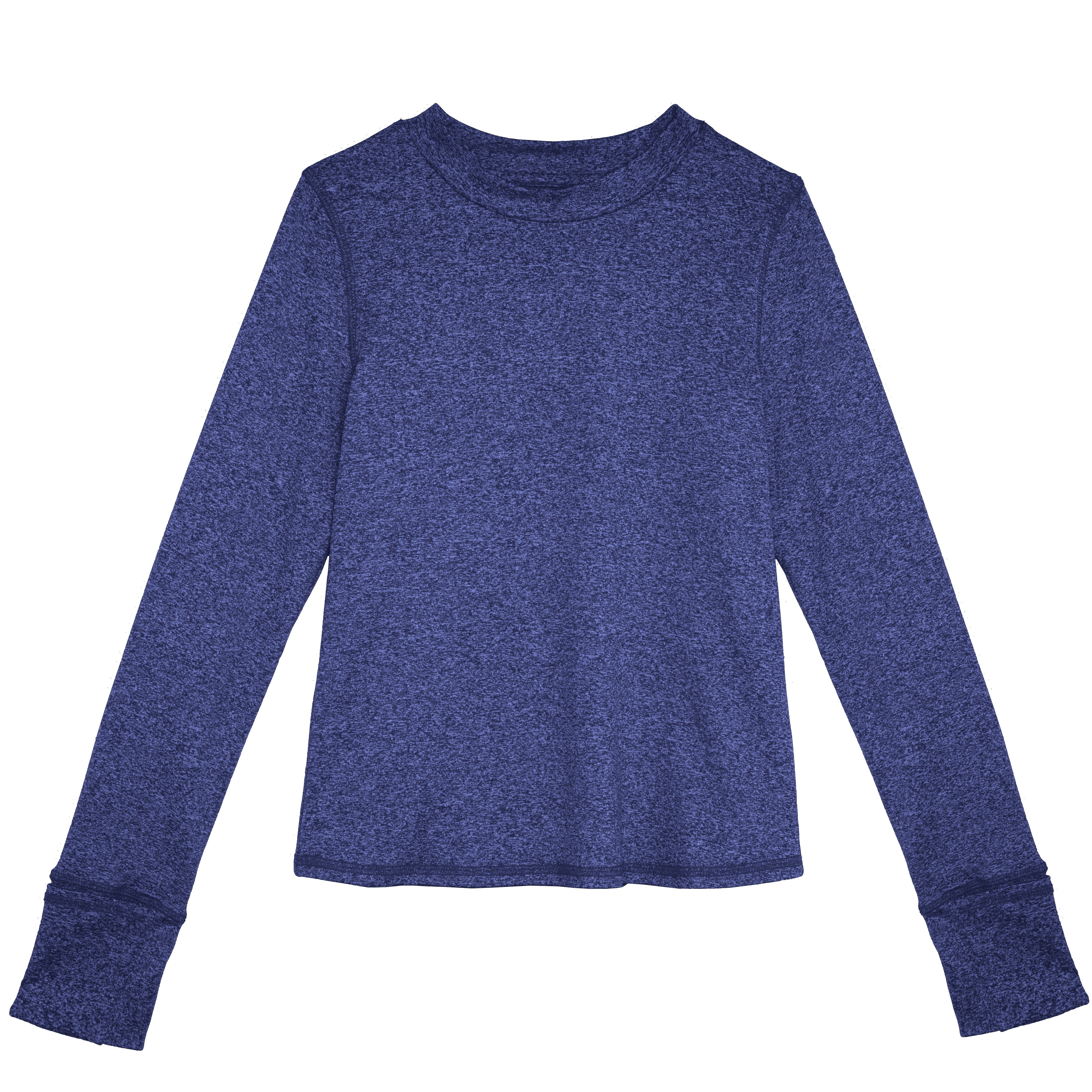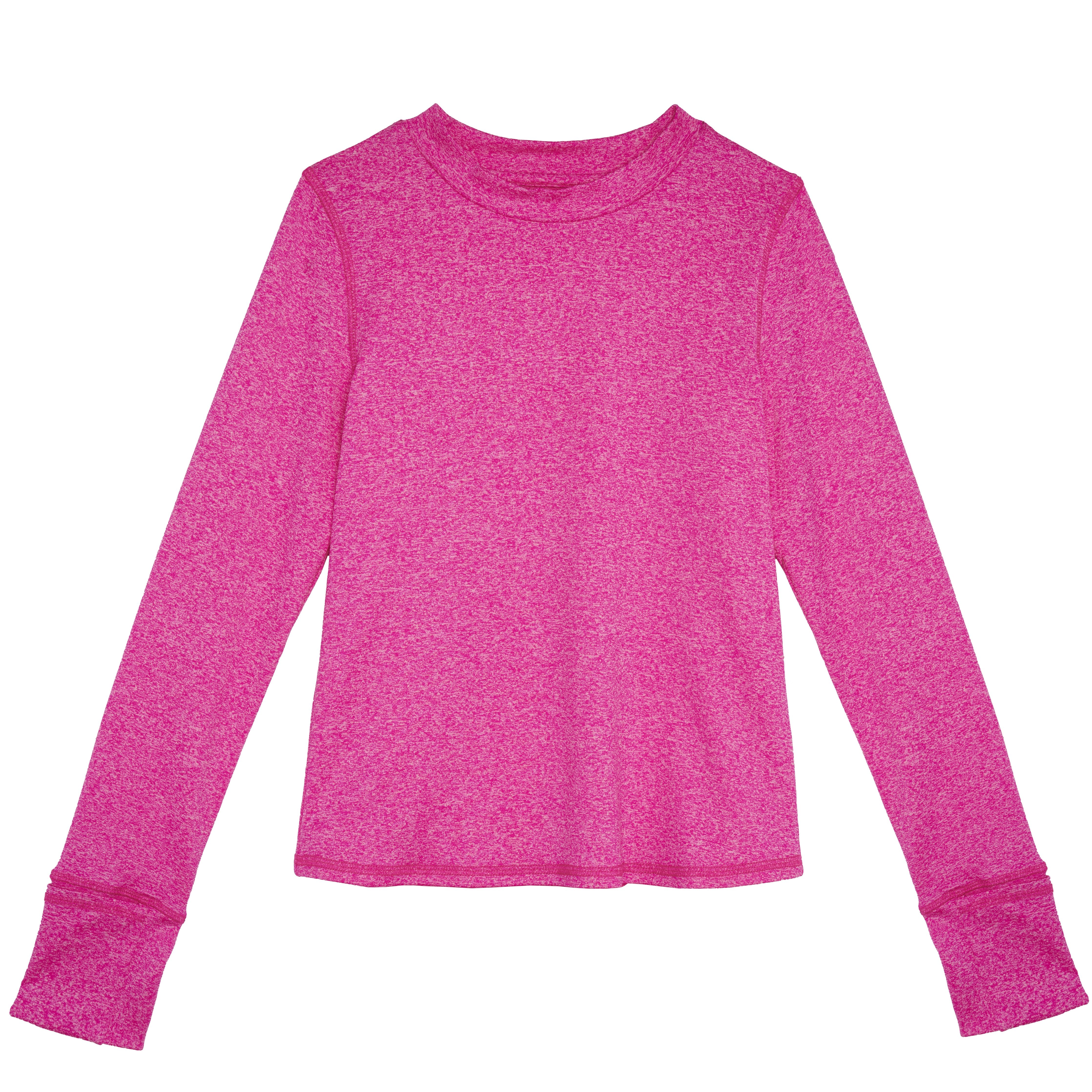 Made with space dyed fabric, this super stretch fitted active top is the perfect piece for a layer of warmth. With thumb hole openings and built in hand warmers, this top is designed for action and comfort.
