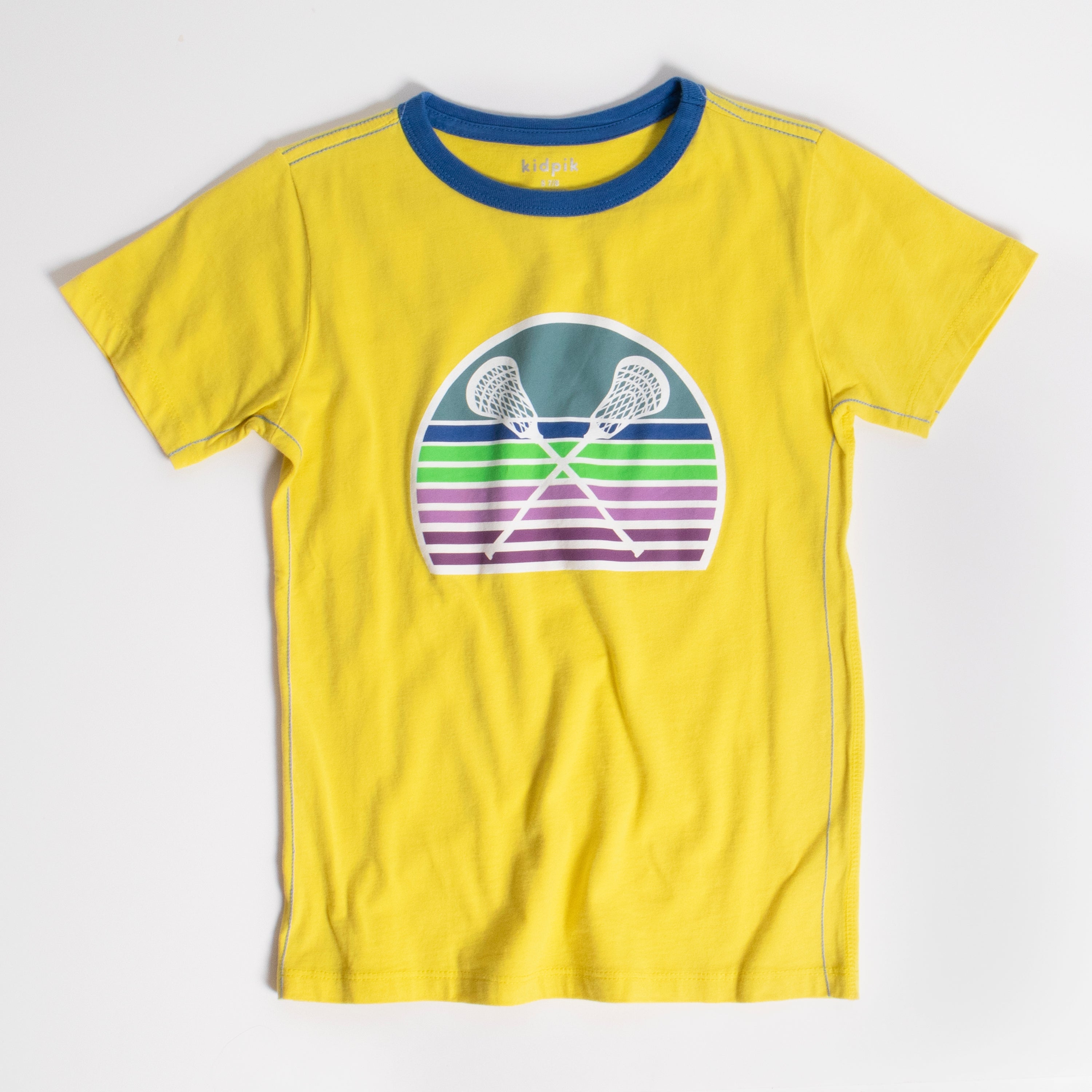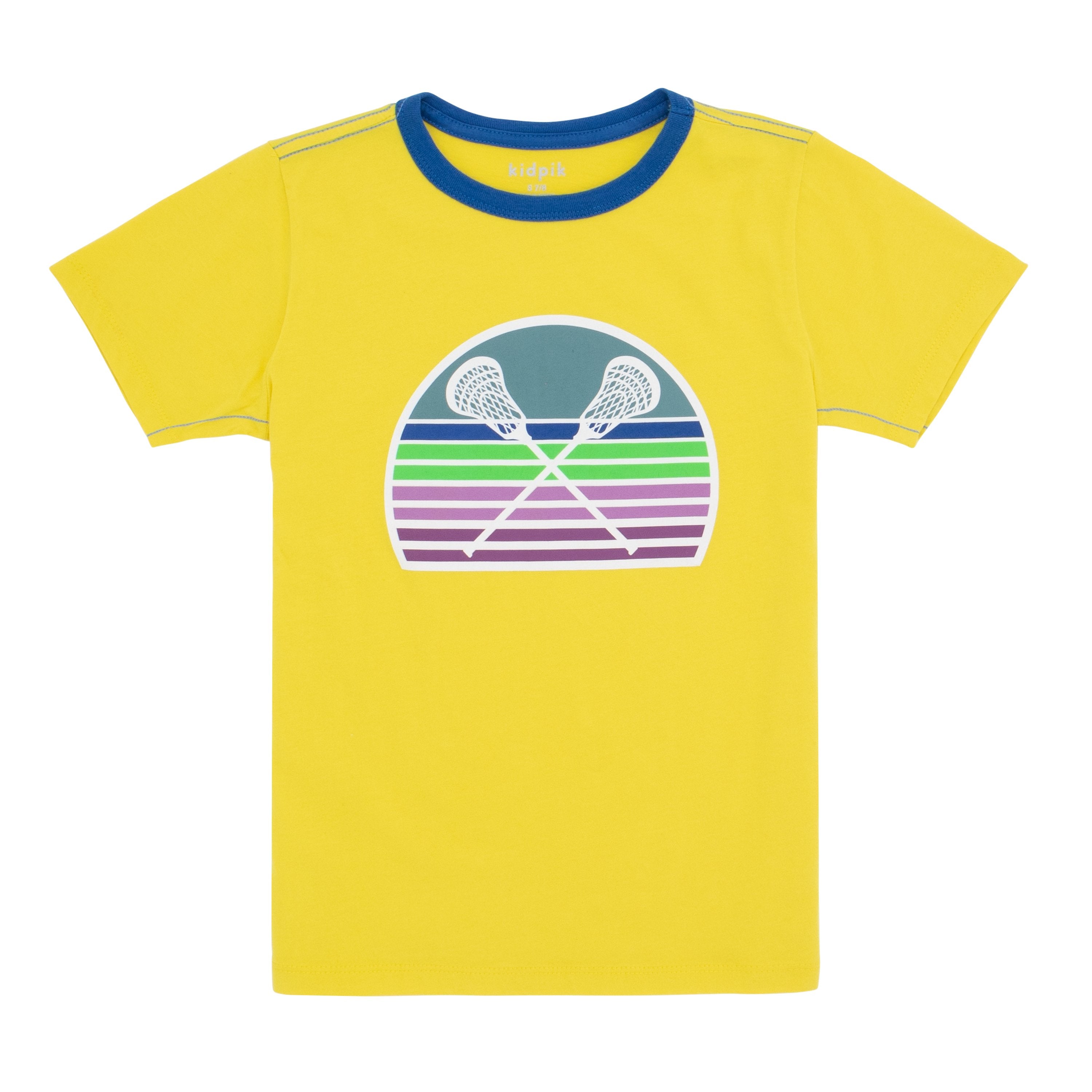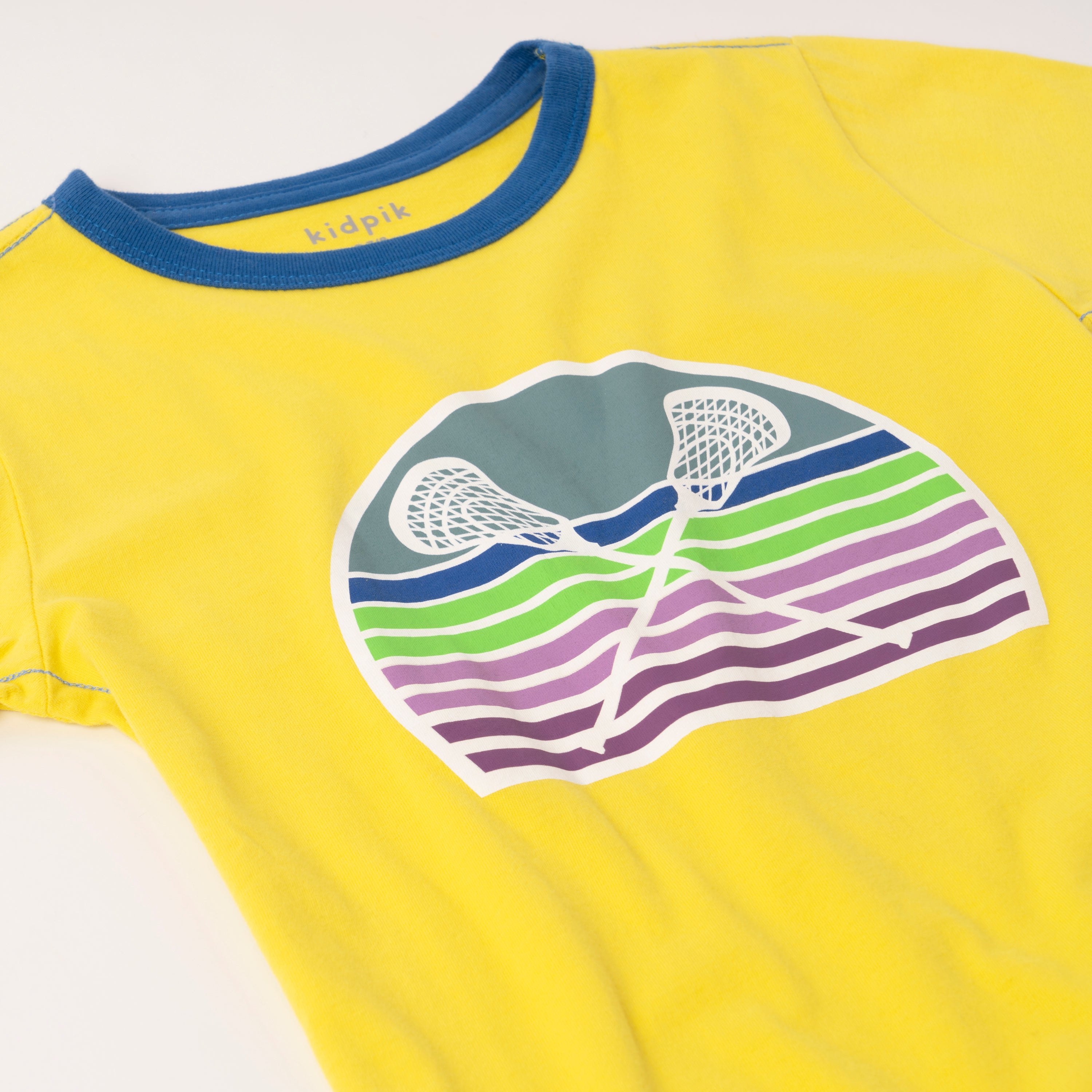 This comfy graphic ringer top is made of light weight cotton jersey featuring contrast neck and chain stitches, short sleeves and lacrosse graphic art at the front.