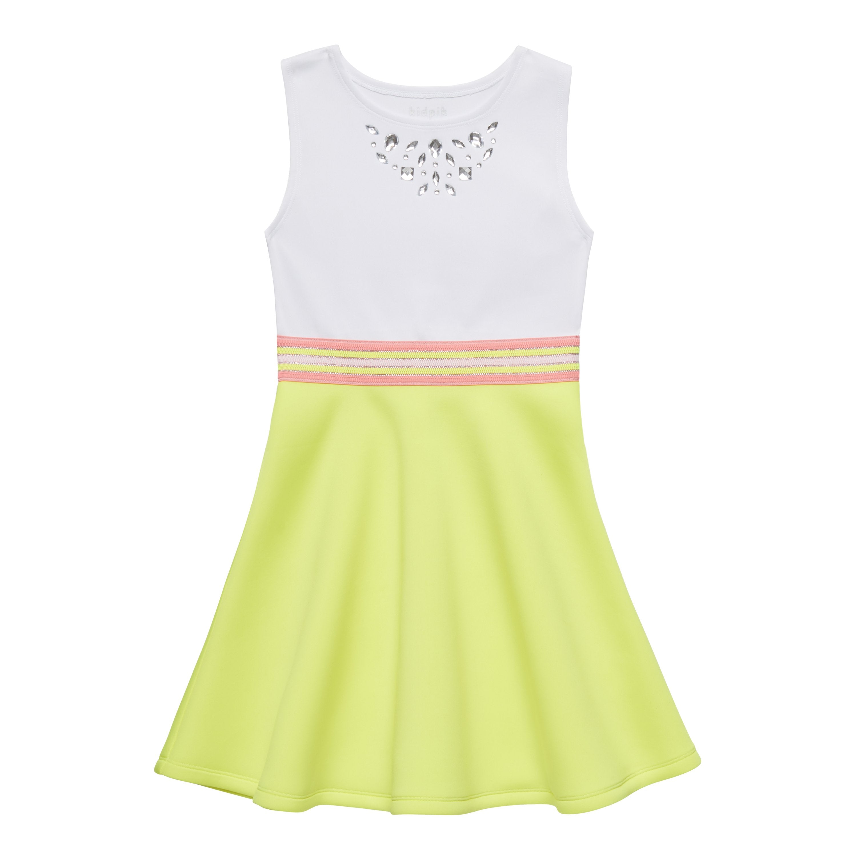 A sleeveless knit color blocked scuba dress featuring embellished clear rhinestone pattern around neckline and a fun bright multi-colored exposed elastic waistband.