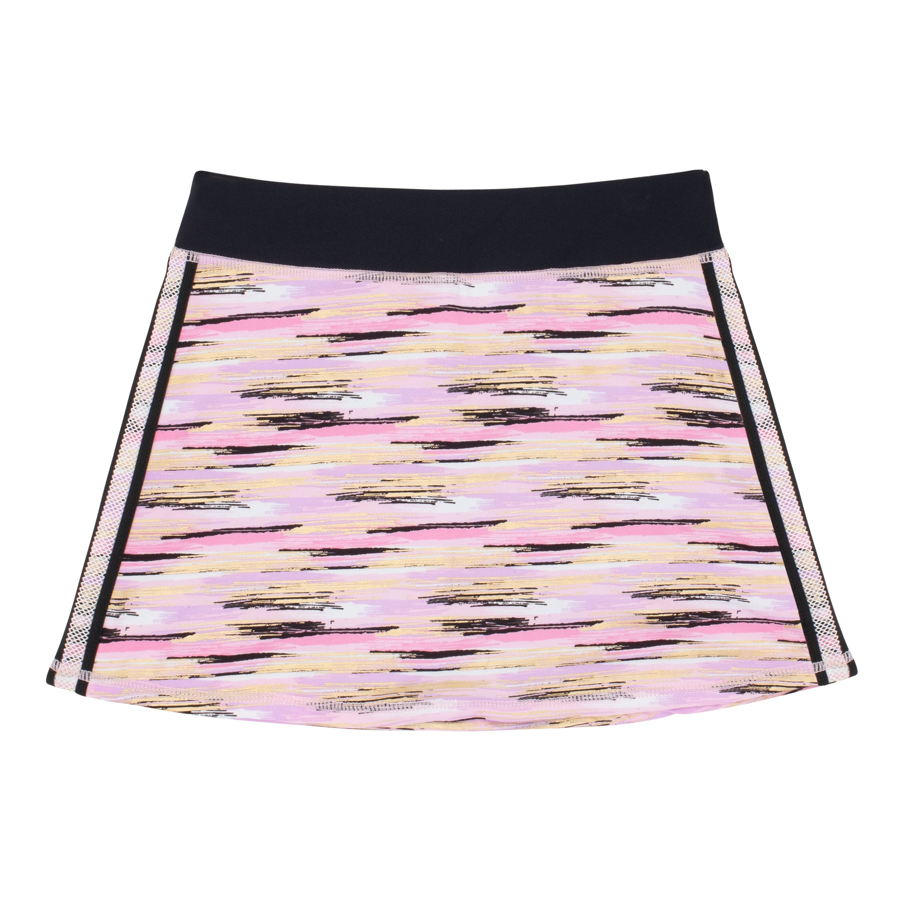 This Fashionable active skort is perfect for all your favorite sports. The brush stroke print was designed in house and features gold foil splashed through pinks and purples hues. Your kid will be a blur of golden pastel dreams when she sprints past you w