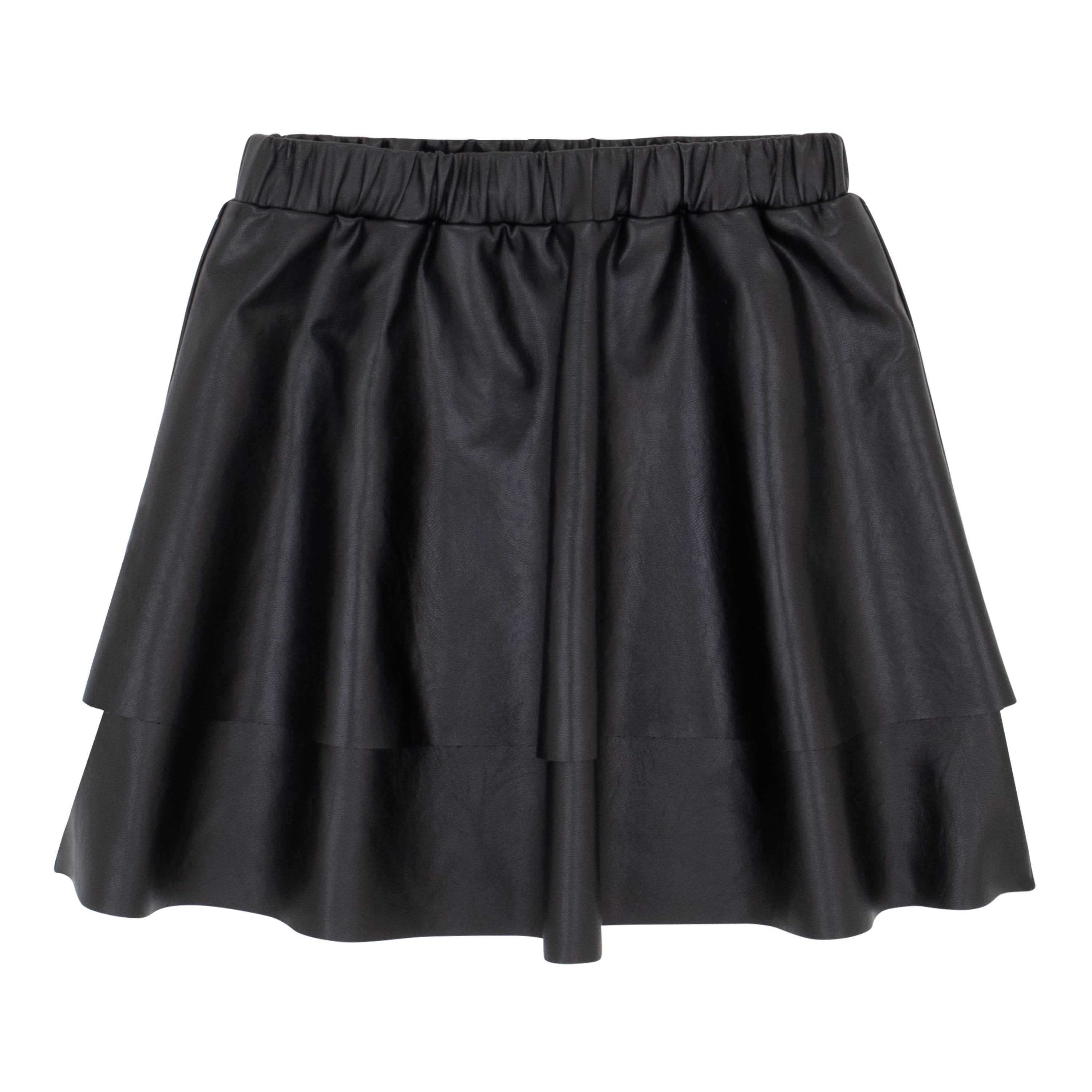 Pleather loves look no further! This tiered pleather skirt can be dressed up or down but will always look fashionable. Features encased elastic at waistband for ease. 100 Polyester PU Pleather Machine wash Imported
