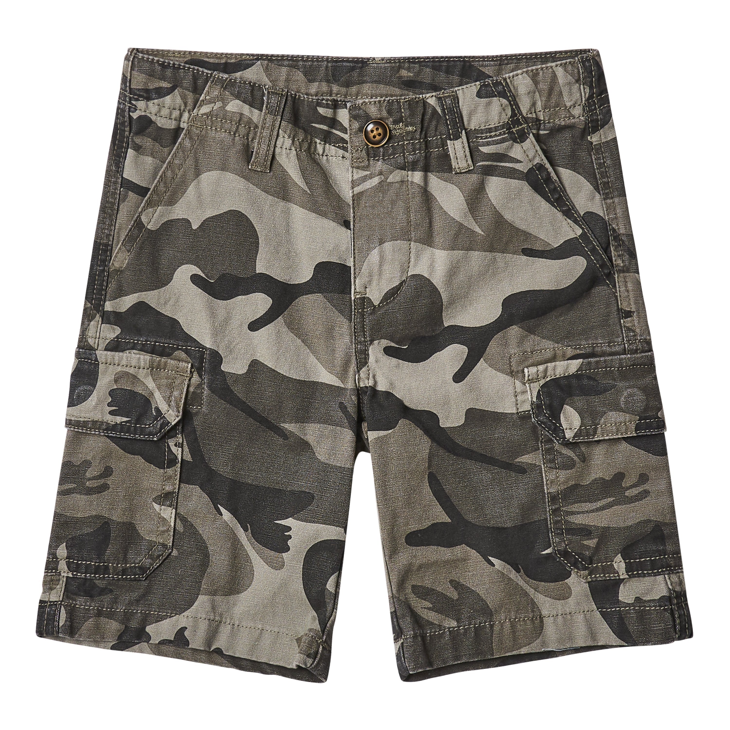 Camo canvas shorts with fully functional waistband featuring cargo pockets. 100 Cotton Printed Canvas w/Camo Print Machine wash Imported